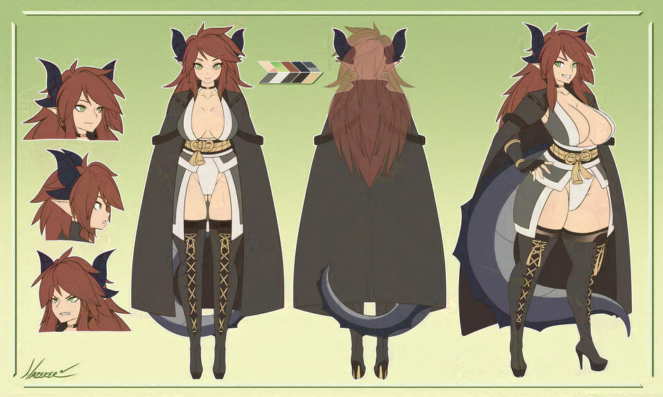 Front and Back views, a dynamic-ish 3/4 view and a few expressions.